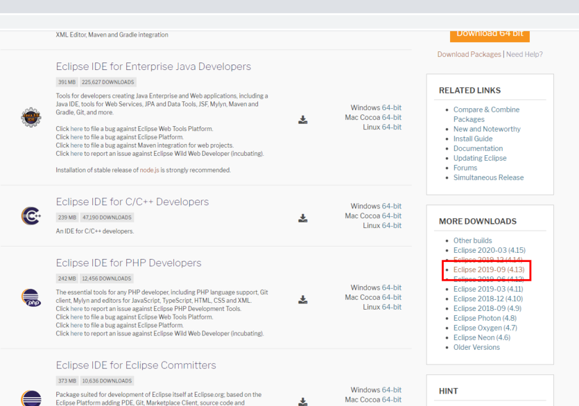 스크롤을 아래로 조금 내리면 오른쪽에 Eclipse 버전을 선택할 수 있다.