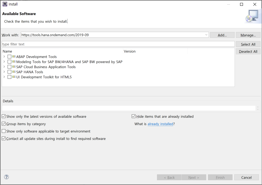 This site allows you to install various SAP development tools. The downloads are provided under the terms of the SAP DEVELOPER LICENSE AGREEMENT. Eclipse Software Sites To install some or all of the Eclipse tools, get an installation compatible with the de