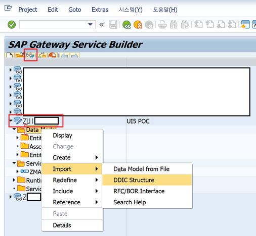 그다음 위의 경로와 같이 Data Model 에서 마우스 오른쪽 클릭 -> Import -> DDIC Structure