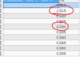 위와 같이 사용할 경우 fieldname 에 G15, G30 이 있을 경우 순서대로 1, 2를 찍어준다.