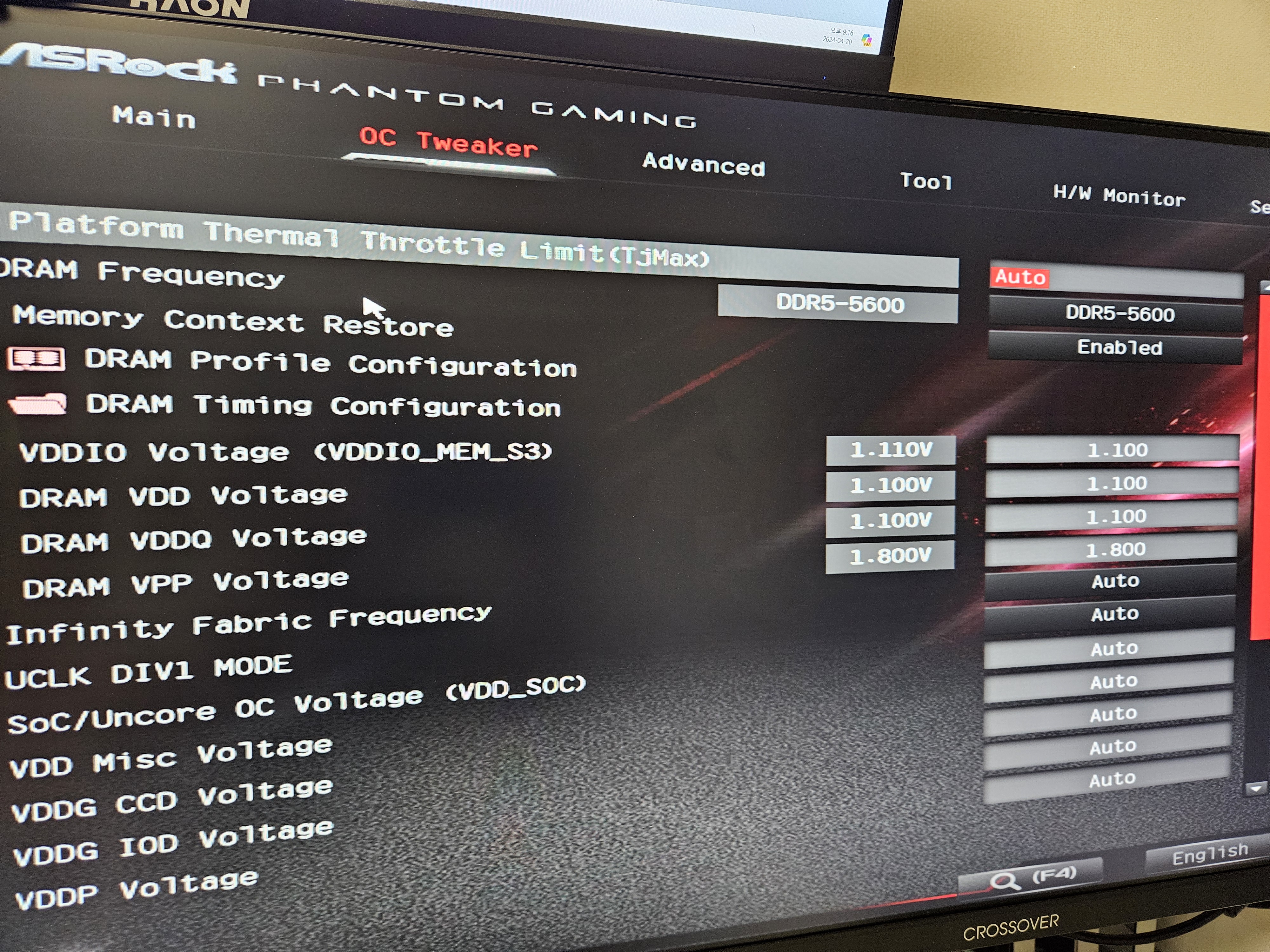 DRAM Frequency 로 램이 지원하는 클럭으로 변경하니 바로 적용 완료!